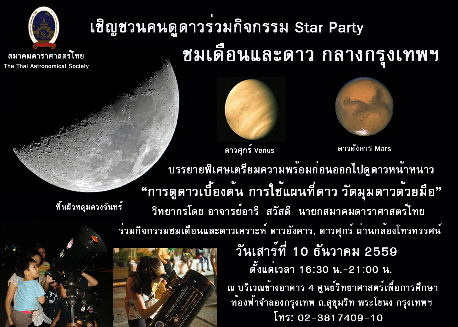 เข้าสู่หน้าหนาวแล้วท้องฟ้าเริ่มเปิดแจ่มใสเป็นฤดูแห่งการชมดาวกันแล้วครับ เพื่อเตรียมตัวความพร้อมก่อนออกไปตามสถานที่ท่องเที่ยวต่างๆ นอนดูดาวหน้าหนาวนี้ สมาคมดาราศาสตร์ไทยเชิญชวนมาร่วมกิจกรรม Star Party กลางกรุงเทพฯ มีการบรรยายพิเศษ เรื่อง "การดูดาวเบื้องต้น การใช้แผนที่ดาว วัดมุมดาวด้วยมือ" ก่อนออกไปดูดาวหน้าหนาว ช่วงค่ำมีบริการตั้งกล้องโทรทรรศน์ดูพื้นผิวดวงจันทร์ที่เป็นหลุมอุกกาบาต ทะเลแห่งความสงบ สันเขาบนดวงจันทร์ ที่ไม่ค่อยได้เห็น ดูดาวเคราะห์ 2 ดวง ที่ให้เห็นในค่ำคืนนี้ มีดาวศุกร์และดาวอังคาร ดูวัตถุท้องฟ้าผ่านกล้องโทรทรรศน์