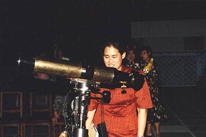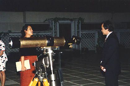 สมเด็จพระเทพรัตนราชสุดาฯ สยามบรมราชกุมารี ทอดพระเนตรกล้องโทรทรรศน์ส่วนพระองค์ ซึ่งเป็นกล้องชนิดหักเหแสง ขนาดเส้นผ่านศูนย์กลาง 100 มิลลิเมตร ความยาวโฟกัส 500 มิลลิเมตร