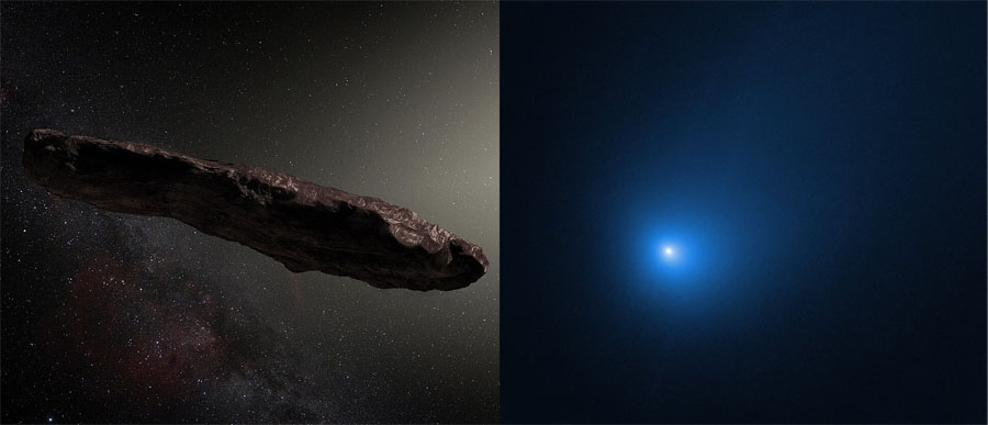วัตถุระหว่างดาวสองดวงแรกที่ค้นพบ ดวงแรก (ซ้าย) คือ โอมูอามูอา (1I/'Omuamua) (เป็นภาพวาดตามจินตนาการ ไม่ใช่ภาพจริง ดวงที่สอง (ขวา) คือ ดาวหางบอริซอฟ (2I/Borisov)