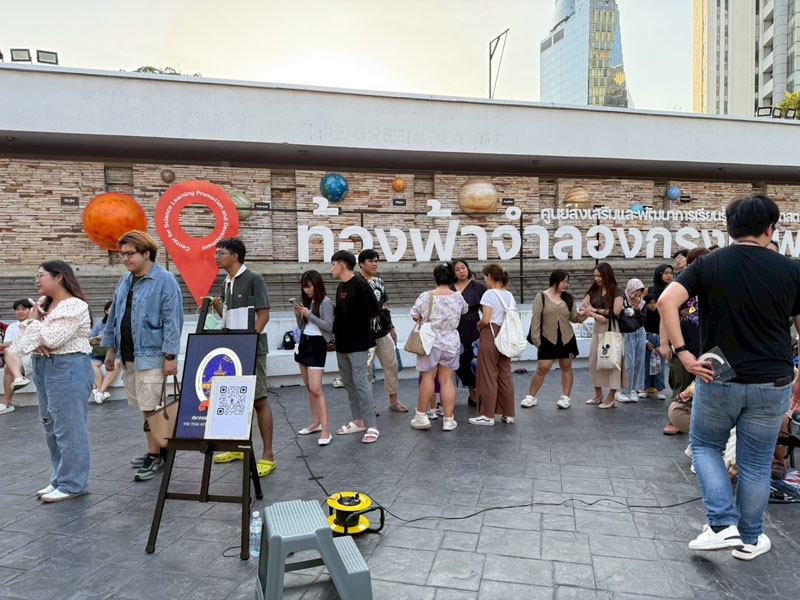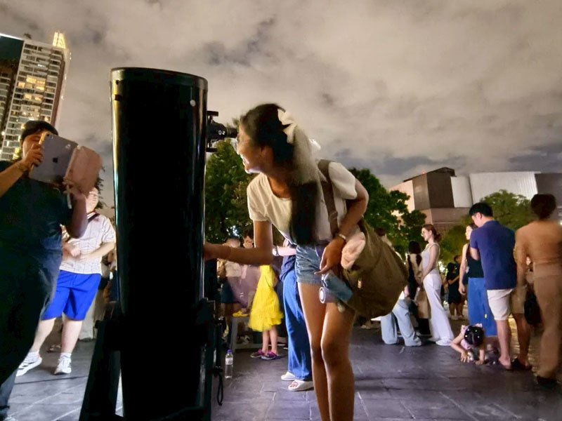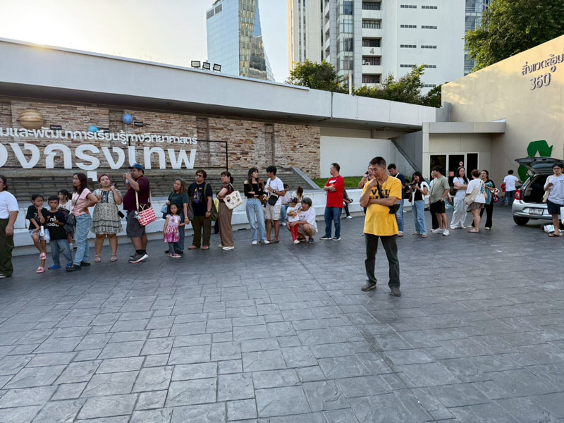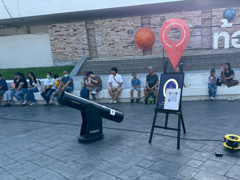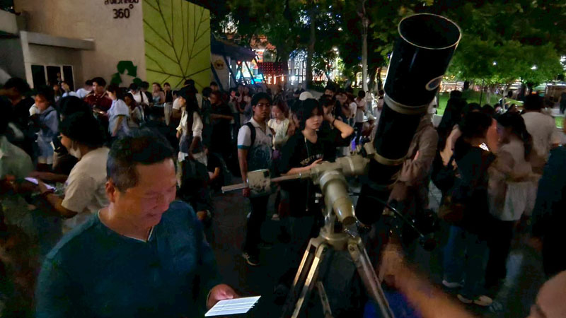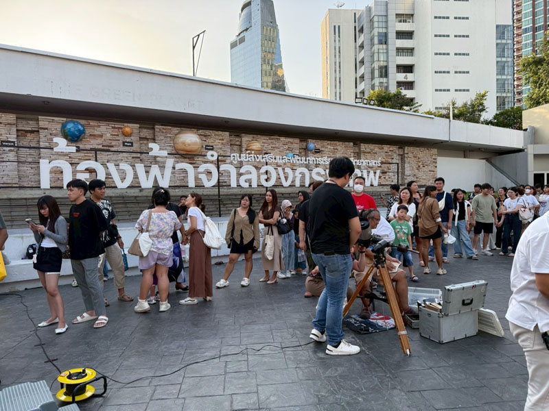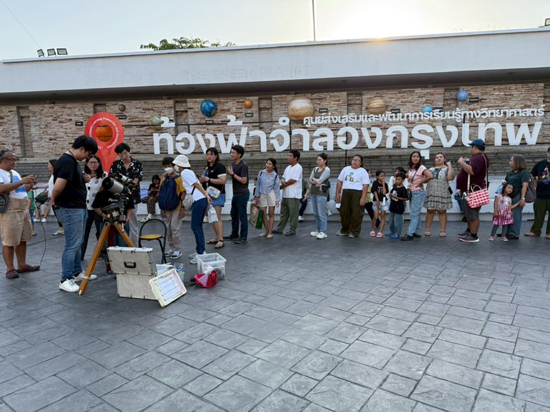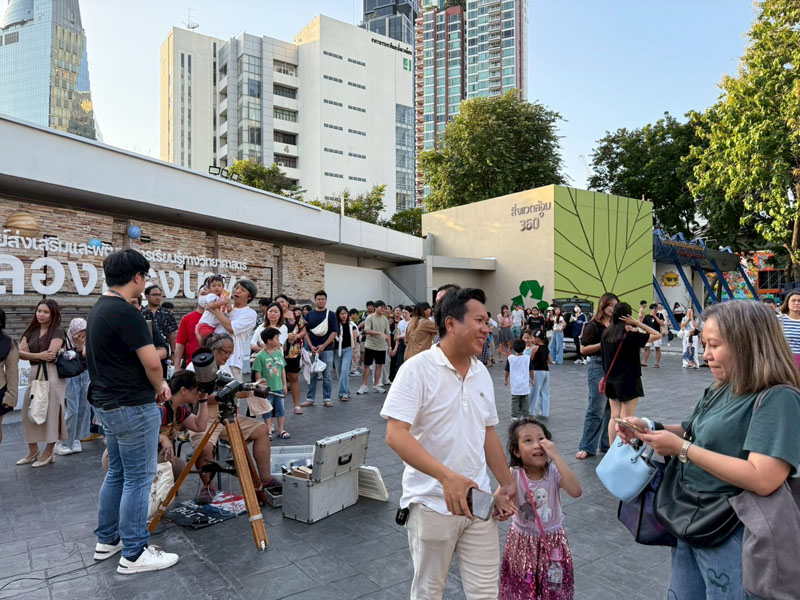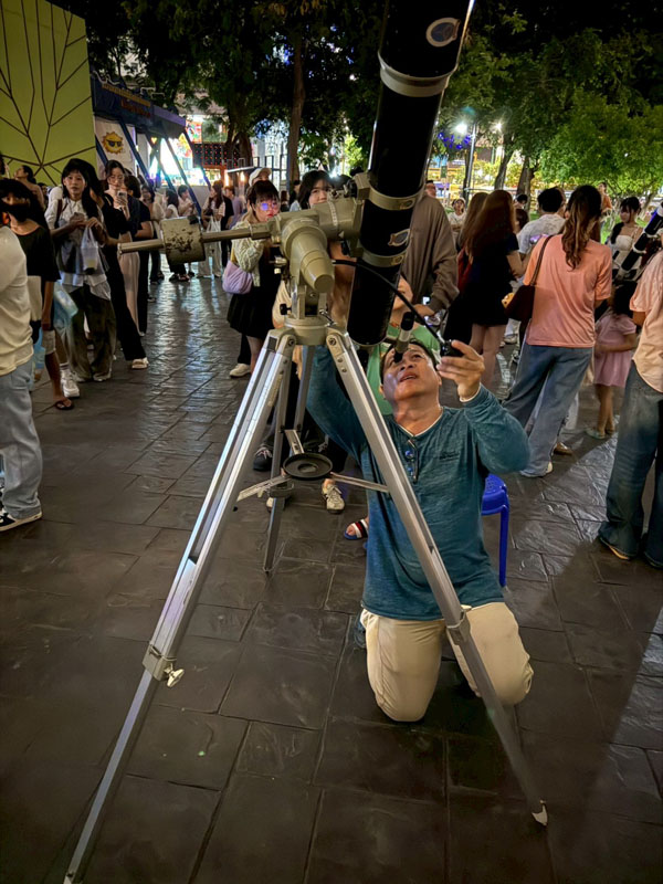 วันนี้อากาศร้อนอบอ้าวตั้งแต่สายๆ แต่ประชาชนก็ยังทยอยกันมาเข้าร่วมกิจกรรม ต่อแถวดูดาวผ่านกล้องโทรทรรศน์ของสมาคมฯ 4 ตัว ของทางท้องฟ้าจำลองกรุงเทพนำมาตั้งอีก 2 ตัว ก็ยังไม่เพียงพอต่อความต้องการประชาชนมีแบบมาเป็นครอบครัว เด็กเล็ก วัยรุ่น ชาวต่างชาติ ได้มีการต่อคิวแถวยาวไปถึงบนถนนสุขุมวิทกันทีเดียว บนเวทีมีการแสดงดนตรีสด และมีการพูดคุยกับ Influencer ด้านดาราศาสตร์ คุณกรทอง วิริยะเศวตกุล (กร) นักสื่อสารด้านดาราศาสตร์อีกด้วย