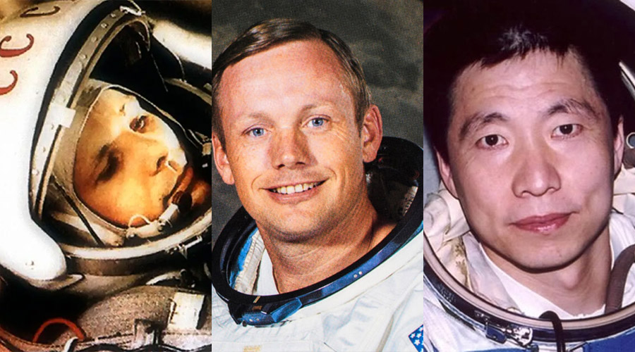 (ซ้าย) ยูริ กาการิน เป็น cosmonaut (กลาง) นีล อาร์มสตรอง เป็น astronaut (ขวา) หยาง ลี่เหว่ย เป็น taikonaut