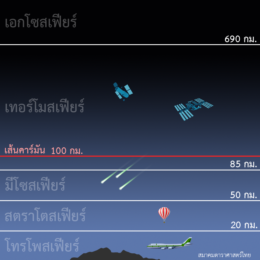 แล้วพรมแดนของอวกาศอยู่ตรงไหน อวกาศหมายถึงบริเวณที่อยู่นอกชั้นบรรยากาศโลกออกไป แต่เนื่องจากชั้นบรรยากาศโลกไม่มีขอบเขตแน่ชัด เมื่อขึ้นสูงไปเรื่อย ๆ ความดันและความหนาแน่นของบรรยากาศจะค่อย ๆ น้อยลงไปอย่างต่อเนื่อง แม้จะขึ้นไปสูงถึงระดับพันกิโลเมตรก็ยังอยู่ในบรรยากาศชั้นเอกโซสเฟียร์อยู่แม้จะเบาบางมากก็ตาม ในเมื่อไม่มีขอบเขตทางกายภาพที่ชัดเจนให้ยึดถือ เส้นพรมแดนของอวกาศจึงต้องกำหนดโดยการตกลงกันระหว่างองค์กรที่เกี่ยวข้อง ปัจจุบันขอบเขตของอวกาศที่ยอมรับกันเป็นนิยามที่กำหนดโดย สหพันธ์การบินนานาชาติ หรือเอฟเอไอ (Fédération Aéronautique Internationale -- FAI) ว่า เหนือระดับน้ำทะเลขึ้นไป 100 กิโลเมตรคือเส้นแบ่งระหว่างชั้นบรรยากาศกับอวกาศ เส้นแบ่งนี้เรียกว่า เส้นคาร์มัน (Kármán line)