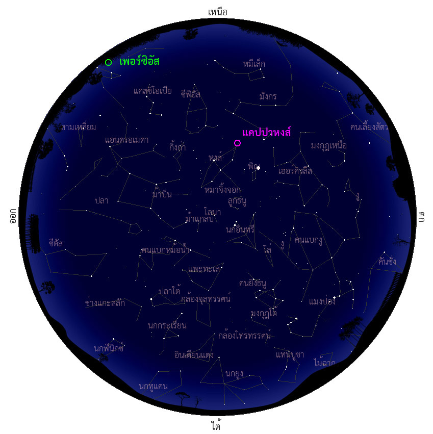 วงสีเขียวคือตำแหน่งของจุดกระจายฝนดาวตกเพอร์ซิอัส วงสีบานเย็นเป็นตำแหน่งของจุดกระจายฝนดาวตกแคปปาหงส์