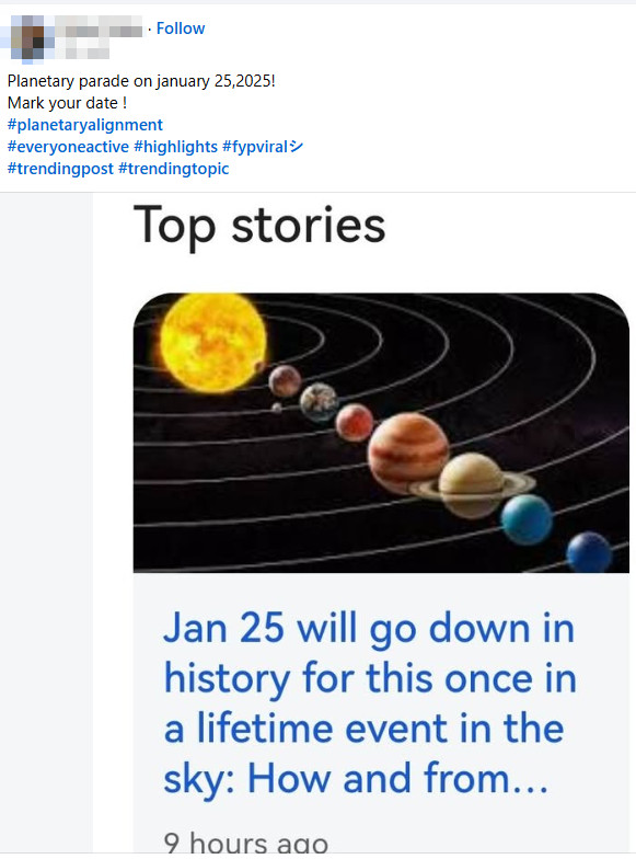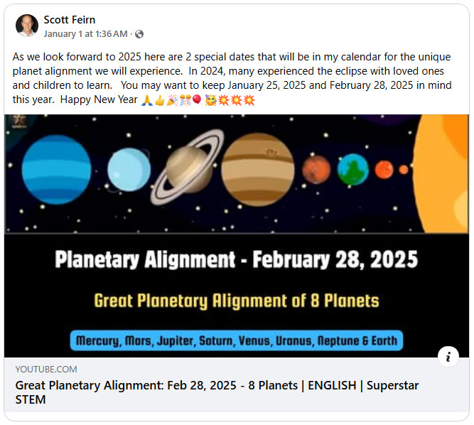 เมื่อต้นปี 2568 เกิดกระแสข่าวแพร่สะพัดในติ๊กต็อก ในเอกซ์ และเฟซบุ๊ก ว่า วันที่ 25 มกราคม 2568 นี้ จะเกิดปรากฏการณ์ดาวเคราะห์เรียงตัวกัน 7 ดวง เป็นปรากฏการณ์ที่หาดูได้ยากยิ่ง ให้กาปฏิทินรอไว้เลย มีโอกาสแค่ครั้งเดียวในชีวิต บางโพสแสดงภาพประกอบที่แสดงภาพของดาวเคราะห์บริวารของดวงอาทิตย์เจ็ดแปดดวงเรียงต่อกันเป็นเส้นราวกับลูกชิ้นเสียบไม้อย่างไรอย่างนั้นเช่น