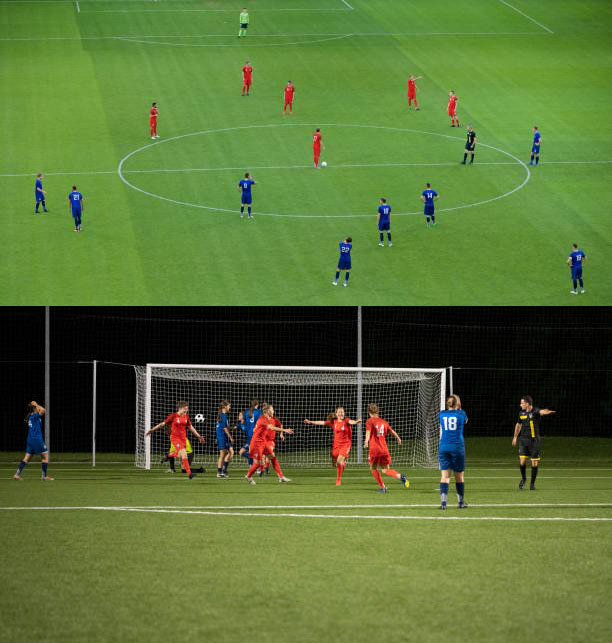 (บน) นักฟุตบอลวิ่งอยู่ในสนาม เมื่อมองจากมุมที่สูงจากระนาบ จะเห็นนักฟุตบอลมีตำแหน่งกระจัดกระจายไปทั่วสนาม (ล่าง) เมื่อมองจากระดับเดียวกับนักฟุตบอลที่อยู่บนสนามจะมองเห็นนักฟุตบอลทุกคนมีเรียงกันเป็นแถวเสมอ เพราะทุกคนรวมถึงผู้มองอยู่ในระนาบเดียวกันนั่นคือสนามฟุตบอลนั่นเอง