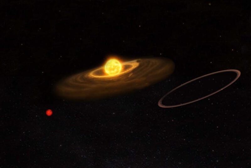 ภาพในจินตนาการของศิลปิน แสดงดาวอัสแซสซิน-24 เอฟดับเบิลยู (ASASSN-24fw) หลังจากการบังผ่านพ้นไป ดาวดวงนี้มีจานฝุ่นที่คาดว่าเกิดจากการชนกันเองของดาวเคราะห์ วัตถุที่มาบดบังที่มีวงแหวนขนาดยักษ์อยู่ทางล่างขวาของภาพ ดาวแคระแดงที่เป็นดาวสหายของดาว อัสแซสซิน-24 เอฟดับเบิลยู อยู่ทางล่างซ้ายย (จาก S. Shah et al./ Royal Astronomical Society (CC BY 4.0).)