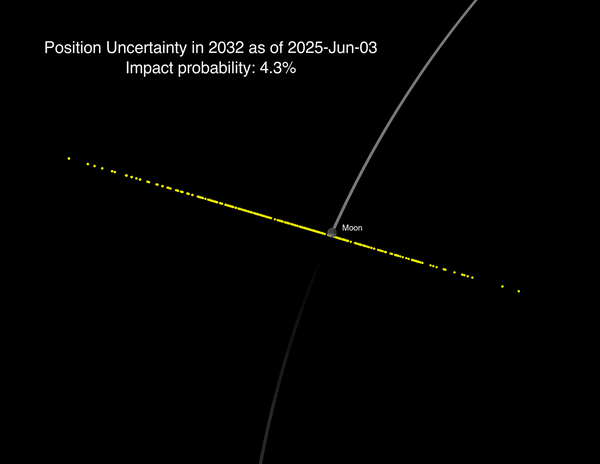 แผนผังแสดงตำความไม่แน่นอนของดาวเคราะห์น้อย 2024 วายอาร์ 4 ที่ระยะของดวงจันทร์ ระหว่างข้อมูลที่ได้จนถึงเดือนมิถุนายน 2568 กับข้อมูลที่ได้จนถึงเดือนกุมภาพันธ์ 2569 ข้อมูลเดิมยังมีช่วงความคลาดเคลื่อนสูง ตำแหน่งที่เป็นไปได้ยังครอบคลุมดวงจันทร์อยู่ จึงมีโอาสที่จะชนดวงจันทร์ ส่วนข้อมูลใหม่ให้ความคลาดเคลื่อนต่ำ ไม่คลุมตำแหน่งของดวงจันทร์อีกแล้ว แสดงว่าจะไม่ชนดวงจันทร์อย่างแน่นอน (จาก NASA)