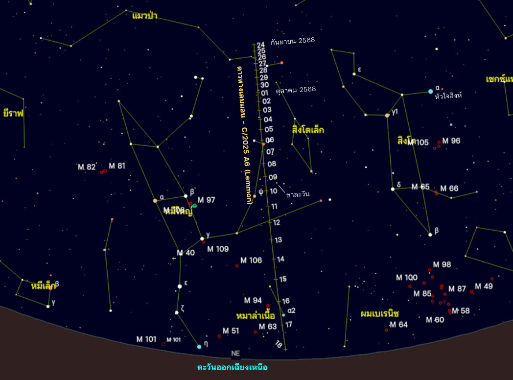 แผนที่ดาวแสดงตำแหน่งดาวหางซี/2025 เอ 6 (เลมมอน) ระหว่างปลายเดือนกันยายนถึงกลางเดือนตุลาคม 2568 คำนวณที่เวลาเช้ามืดของทุกวัน ดาวหางอยู่ทางทิศตะวันออกเฉียงเหนือ เคลื่อนผ่านกลุ่มดาวแมวป่า สิงโตเล็ก หมีใหญ่ และหมาล่าเนื้อ วันที่ 24 กันยายน อาจสว่างราวโชติมาตร 8 หลังจากนั้นมีความสว่างเพิ่มขึ้นด้วยอัตราประมาณ 0.1-0.2 อันดับต่อวัน วันที่ 18 ตุลาคม อาจอยู่ที่โชติมาตร 4-5 แต่วันท้าย ๆ ดาวหางจะอยู่ใกล้ขอบฟ้าจนอาจสังเกตได้ยาก (จาก Cartes du Ciel 4.3)