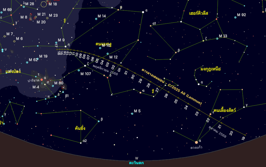 แผนที่ดาวแสดงตำแหน่งดาวหางซี/2025 เอ 6 (เลมมอน) ระหว่างกลางเดือนตุลาคมถึงกลางเดือนพฤศจิกายน 2568 คำนวณที่เวลาหัวค่ำของทุกวัน ดาวหางอยู่ทางทิศตะวันตก เคลื่อนผ่านกลุ่มดาวคนเลี้ยงสัตว์ งู และคนแบกงู วันที่ 19 ตุลาคม อาจสว่างราวโชติมาตร 4-5 หลังจากนั้นมีความสว่างเพิ่มขึ้นไปถึงราวโชติมาตร 3-4 ในช่วงวันที่ 25 ตุลาคม – 1 พฤศจิกายน ก่อนจะลดความสว่างลงและสังเกตยากขึ้นเรื่อย ๆ (จาก Cartes du Ciel 4.3)