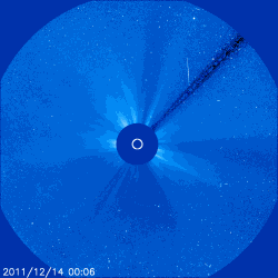 ดาวหางเลิฟจอยระหว่างวันที่ 14-17 ธันวาคม 2554 ในภาพถ่ายคอโรนากราฟของกล้องที่ติดตั้งบนหอสังเกตการณ์โซโฮ (จาก SOHO/ESA/NASA)