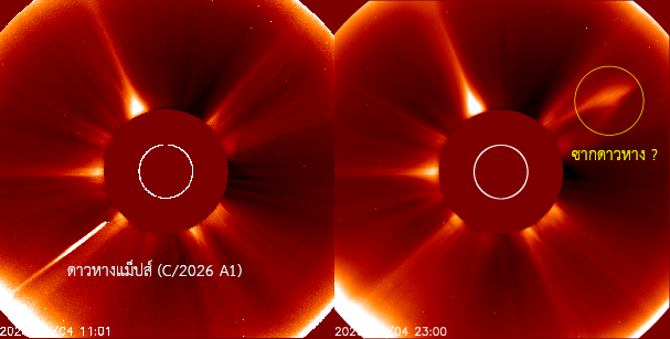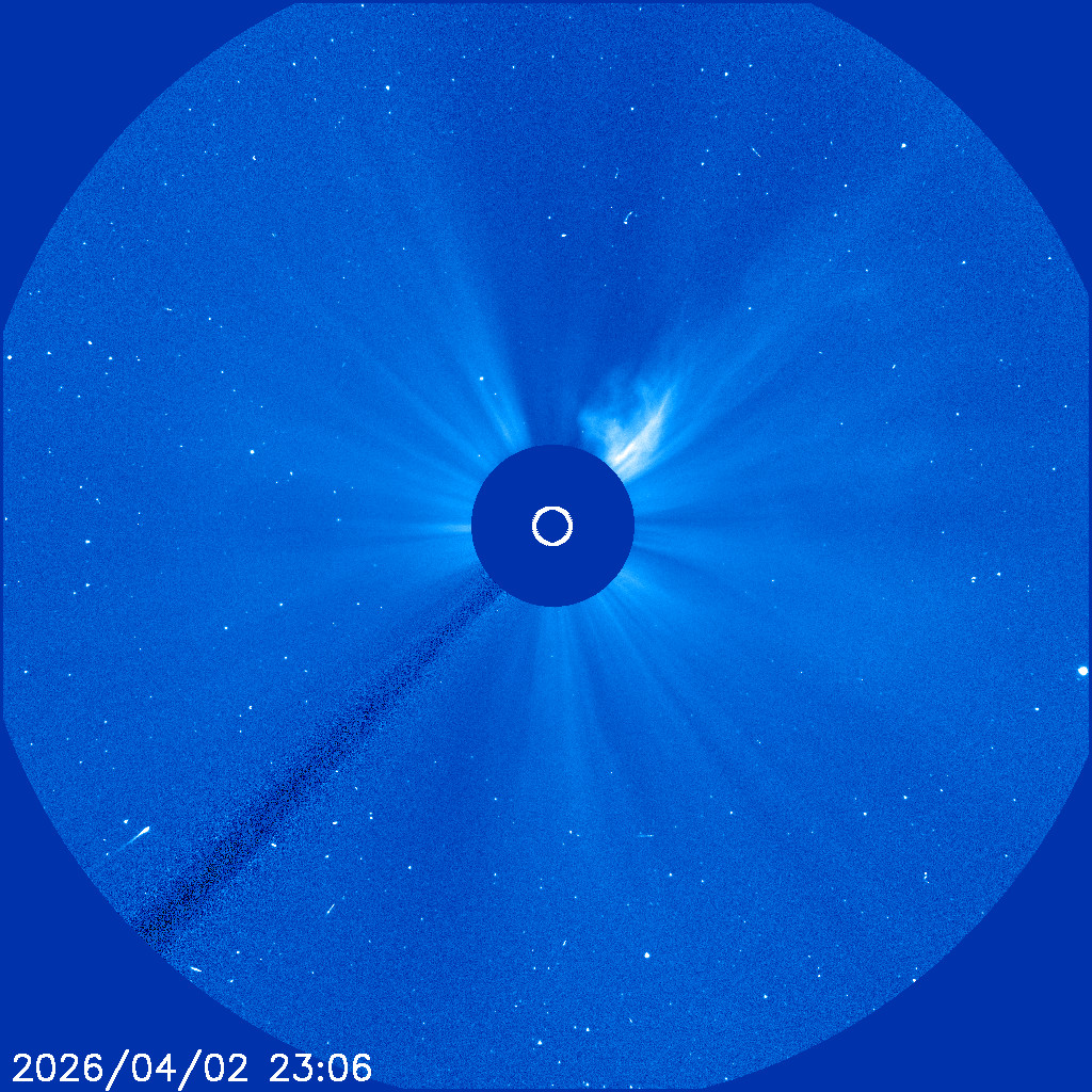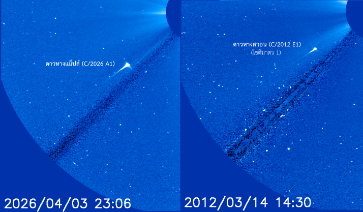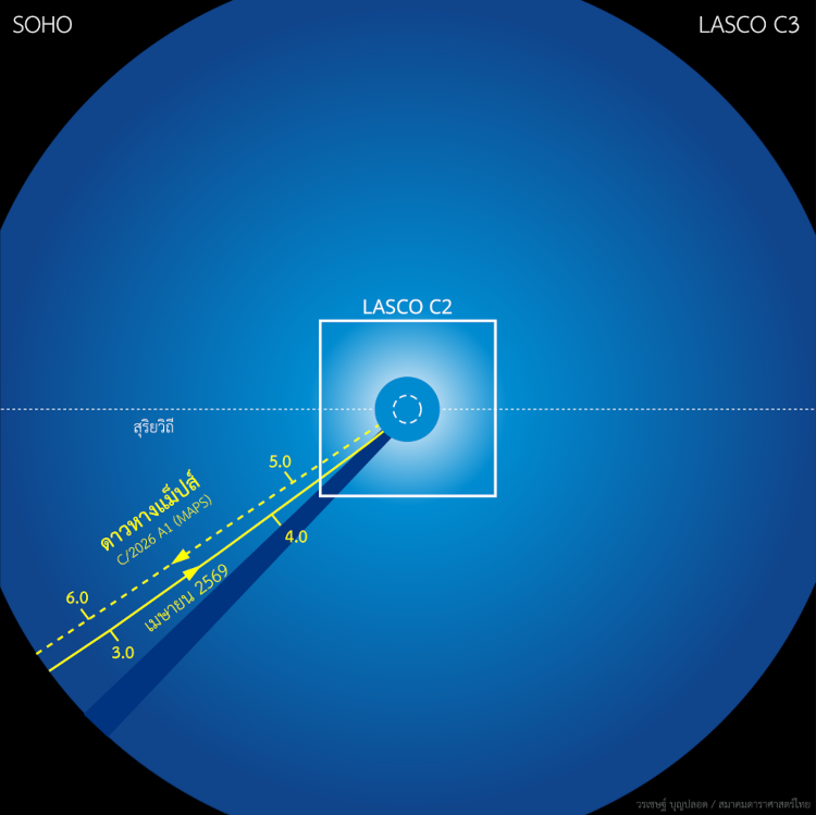 ดาวหางแม็ปส์ในภาพถ่ายจากยานโซโฮเมื่อวันที่ 3 เมษายน 2569 เวลา 06:06 น. ตามเวลาประเทศไทย (จาก SOHO/ESA/NASA)