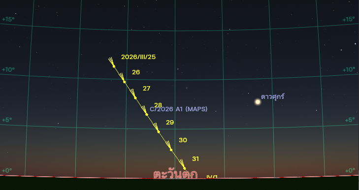 ตำแหน่งดาวหางแม็ปส์บนท้องฟ้าประเทศไทยในช่วงวันที่ 25-31 มีนาคม 2569 เวลา 19:15 น. หรือประมาณ 45 นาทีหลังดวงอาทิตย์ตก แนะนำให้ใช้ดาวศุกร์ซึ่งเป็นดาวเคราะห์สว่างที่สุดบนท้องฟ้าเป็นจุดสังเกต ดาวหางอยู่ทางซ้ายมือของดาวศุกร์ที่ระยะห่างประมาณ 11°-13° มีตำแหน่งอยู่สูงเหนือขอบฟ้าไม่มากและอยู่ท่ามกลางแสงสนธยา หากดาวหางไม่สว่างพอให้เห็นด้วยตาเปล่า ก็จำเป็นต้องใช้กล้องสองตาหรือการถ่ายภาพ (จาก Stellarium)