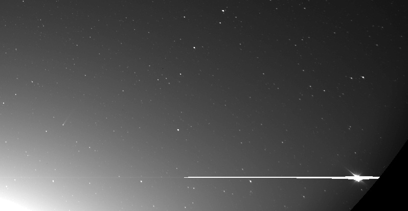 ดาวหางเลิฟจอยซึ่งค้นพบโดยนักดาราศาสตร์สมัครเล่นชาวออสเตรเลีย ภาพนี้ถ่ายขณะปรากฏบนท้องฟ้าในเวลาเช้ามืดของวันที่ 22 ธันวาคม 2554 จากบริเวณที่ตั้งของหอดูดาวปารานาลในชิลี ขณะนั้นดาวหางสว่างที่โชติมาตรประมาณ 3 (จาก G. Blanchard/ESO)