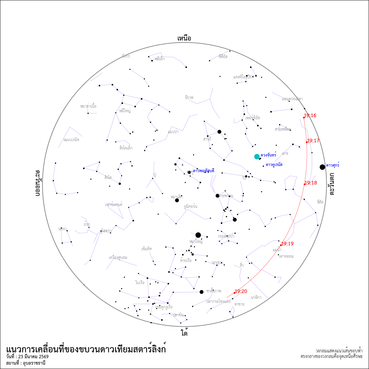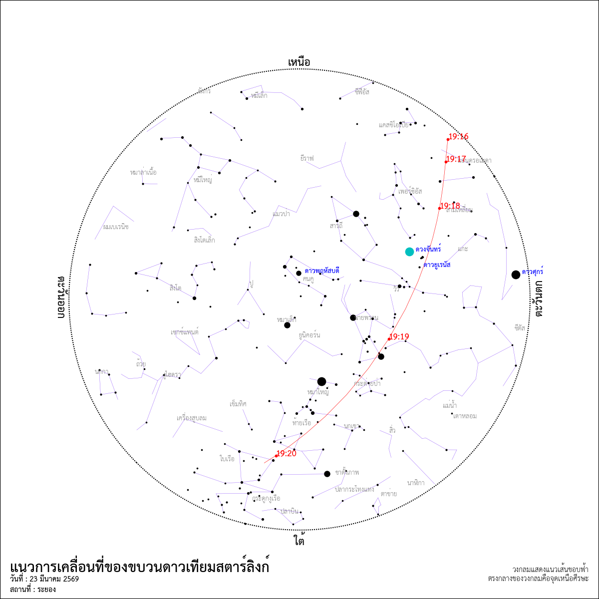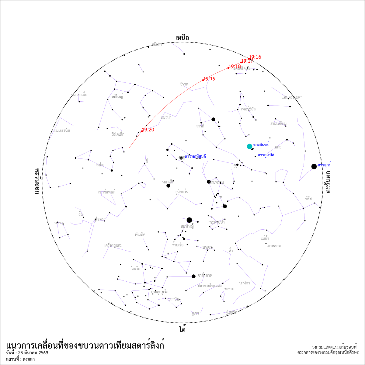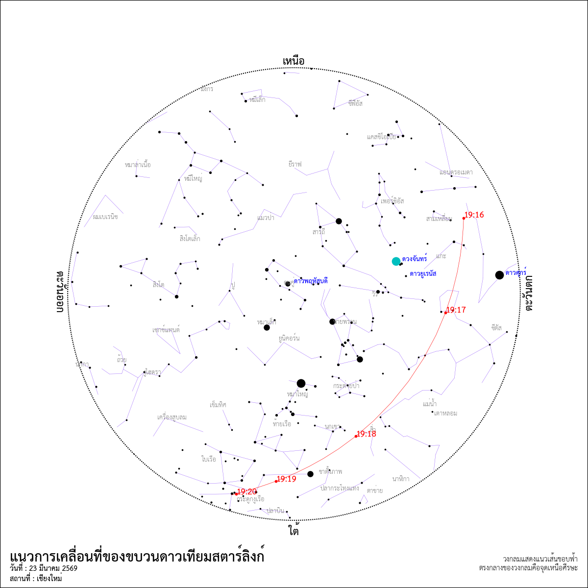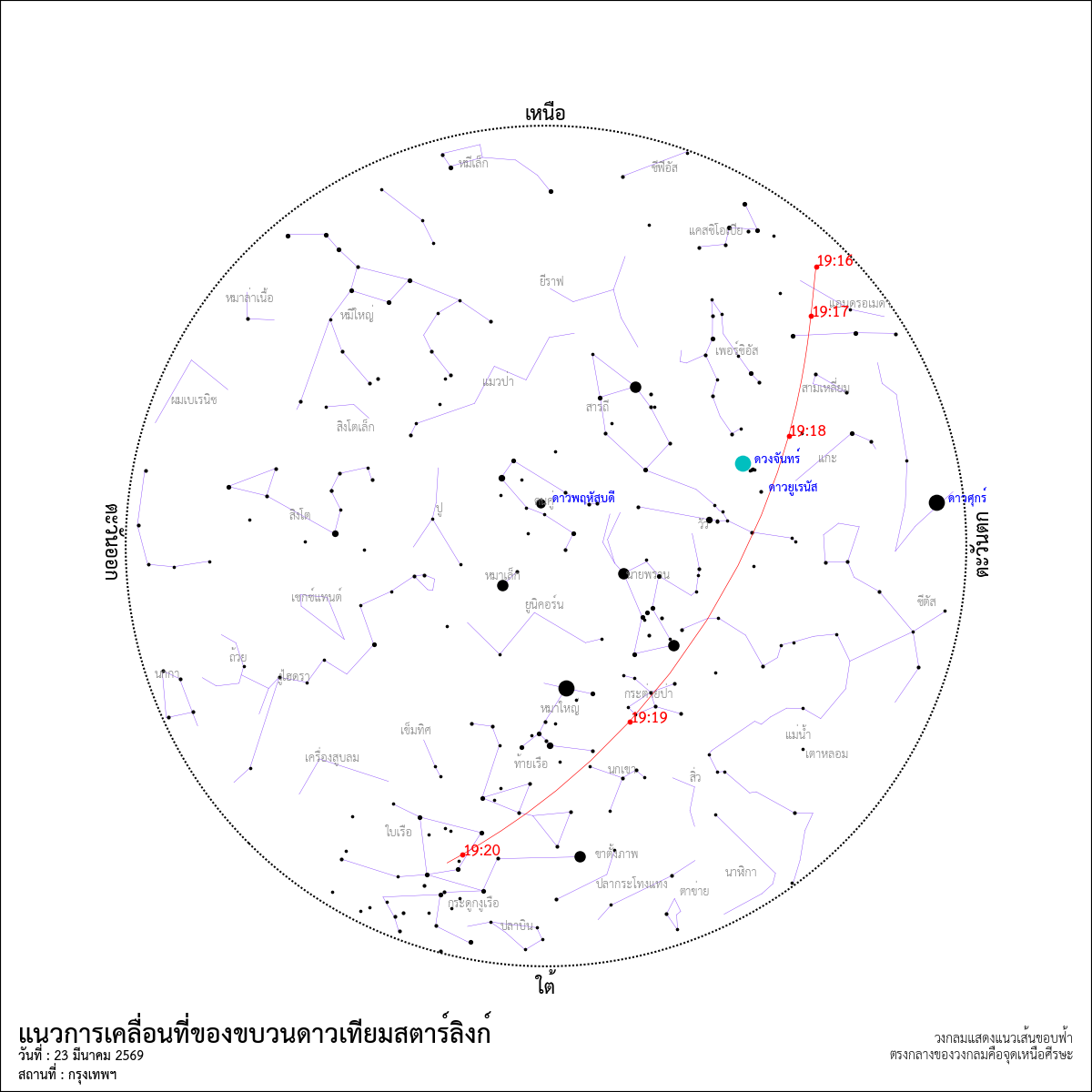 ภาพจำลองแสดงตำแหน่งดาวเทียมสตาร์ลิงก์ที่ส่งขึ้นสู่อวกาศเมื่อวันอาทิตย์ที่ผ่านมาและจะมาปรากฏบนท้องฟ้ากรุงเทพฯ ในหัวค่ำวันที่ 23 มีนาคม 2569 ภาพนี้แสดงตำแหน่งดาวเทียมในกลุ่มที่เวลา 19:18 น. (จาก Stellarium)