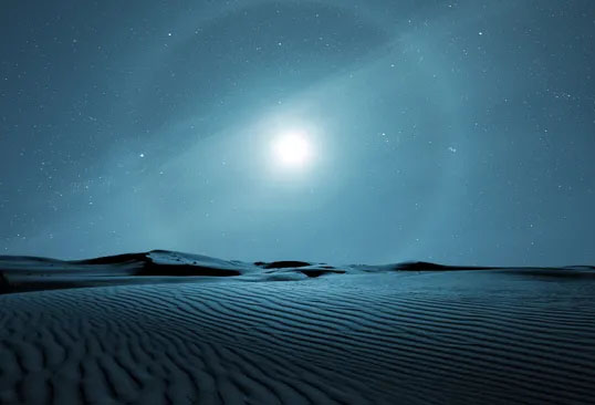 ในเวลากลางคืนเมื่อดวงจันทร์อยู่บนฟ้า และมีเมฆเซียร์รัสกระจายอยู่ใกล้ดวงจันทร์ ก็เกิดปรากฏการณ์แบบเดียวกันได้ เรียกว่า พระจันทร์ทรงกลด