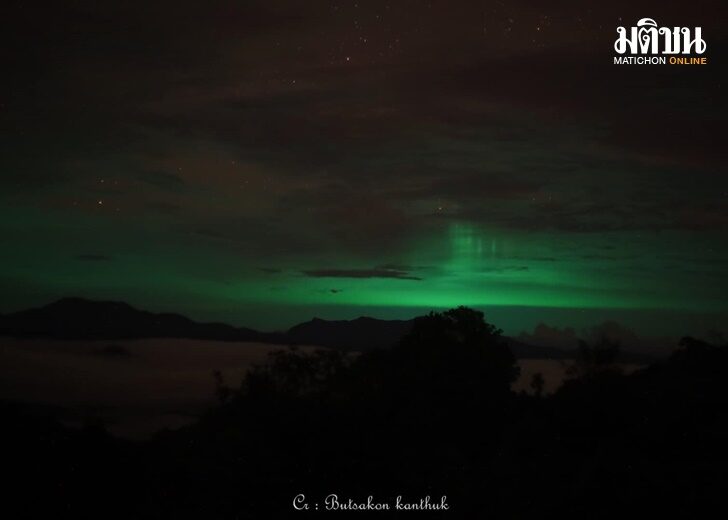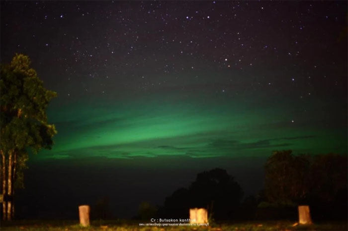 แสงสีเขียวเหนือฟ้าที่พะเนินทุ่ง อุทยานแห่งชาติแก่งกระจาน เกิดจากเรือไดหมึกที่ลอยอยู่ในทะเลอันดามันสะท้อนเมฆบนท้องฟ้า (จาก Butsakon Kanthuk )